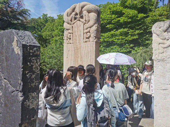 上午十点左右,同学们抵达满城汉墓,五月并不炽热的阳光下,汉旗猎猎迎风招展。甫一踏入景区门口,老师及同学们就被路旁的元明清石碑吸引了视线,大家兴致勃勃的运用从历史文献学课堂上所学习到的知识对碑刻文字内容进行释读,收获良多。