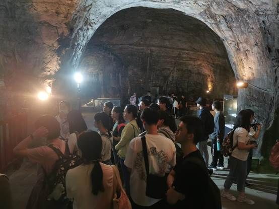 在参观过程中,大家认真聆听了讲解员的介绍,了解到该墓竟是因为1968年解放军在当地挖掘隧道,意外被发现的。之后,在周恩来总理和郭沫若先生的关注、支持下,由卢兆荫先生主持发掘。同时,郭沫若先生指出,西汉中期以前夫妻往往是“同坟异葬”,所以刘胜墓的北部应该还有一个墓室,后果然在该处发现了靖王妻子窦绾之墓。在刘胜墓中,同学们看到了诸多的陪葬品。因刘胜好饮酒,于是在耳室放有大罐美酒陪葬,只是至今日早已挥发完全;在中室看到了汉代的一些精美炊具;在后室,存放有刘胜棺椁的复制品,这里也是“金缕玉衣”和“错金铜博山炉”的出土地。而位于一旁的窦绾墓比刘胜墓面积更大,这是因为刘胜早窦绾多年去世,所以窦绾墓比刘胜墓修筑时间更长,自然面积更大。同时,著名的“长信宫灯”也是自窦绾墓出土。最后,大家分批次从刘胜墓和窦绾墓中走出,都为亲自考察了汉代大墓构造及其陪葬品而发出感概,意犹未尽。