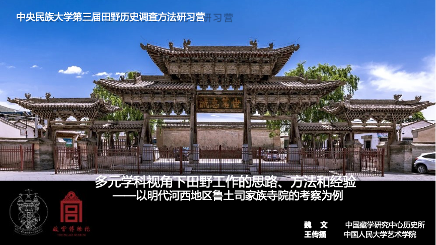 “第三届田野历史调查方法研习营”第三场讲座通过线上平台“腾讯会议”顺利举行。本次讲座由中国藏学研究中心历史所魏文老师主讲,由中国人民大学艺术学院王传播老师担任主持人和对谈人,主题为“多元学科视角下田野工作的思路、方法和经验:以明代河西地区鲁土司家族寺院的考察为例”。