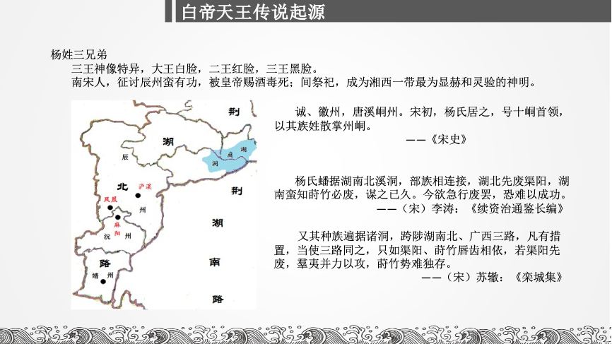 讲座的第三部分,主讲人对白帝天王传说起源作了分析。宋初,朝廷在湘西地区设立羁縻州,赐予酋首和外来大姓官职,形成以溪州为中心的彭氏和以诚州(后改称靖州)为中心的杨氏两大势力集团。其中,诚州杨氏号称十峒首领。相传,杨氏酋首再思之子政隆、政款、政权三人因“平诸蛮,显灵湖北等处”,诏曰“北地天王”,被民间祭祀。龙圣老师指出,北地天王即为白帝天王之雏形。
