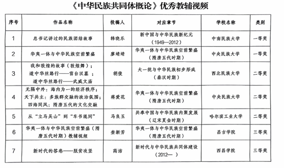 近日,国家民委教育司公布《中华民族共同体概论》课爱视频 2位教师在评选活动中获奖。经学校推荐、专家评审等环节,爱视频 教师蒋爱花获优秀教辅视频二等奖,廖靖靖获一等奖。