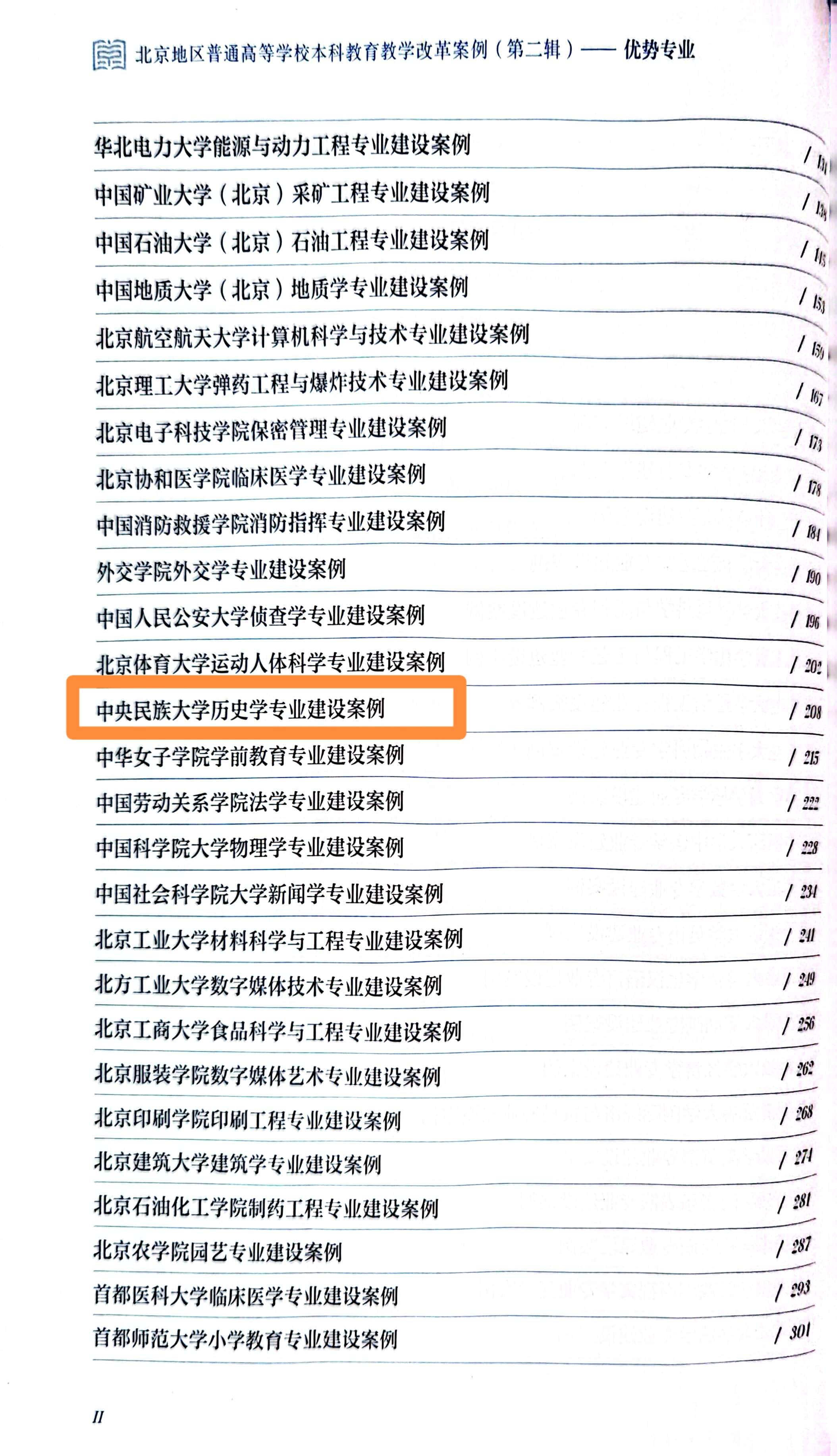 历史学专业于2019年入选国家级一流本科专业建设点。通过两年多的建设,在本科教育教学方面取得了丰硕的成果,并于2022年入选北京市教委主编的《北京地区普通高等学校本科教育教学改革案例》。