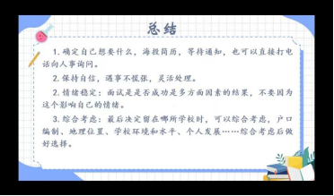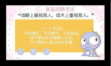 第四位分享的是余桢师姐,师姐的分享以苏格拉底的名言“认识你自己”开始,师姐建议只有了解自身需求才会更有针对性的去做求职准备,首先明确自己的职业目标和生活理念,其次根据自身情况进行选择工作环境、方式,同时要注意教育行业发展变化及发展趋势以便做出最正确的选择。第二部分是招聘信息的收集,师姐强调了一定要积极收集校官网以及其他媒介信息,打破信息壁垒,第三部分就是准备招聘考试,心态上采取“战略性藐视敌人,战术性重视敌人”坚定自我,稳定内核,平和对待,行动上针对地区认真刷题,熟悉教材进行新颖教学设计,提高自身核心竞争力,认真准备。最后师姐建议大家如果选定了目标地方尽早办理当地号码,以便分开工作生活。最后祝愿大家一切顺利!