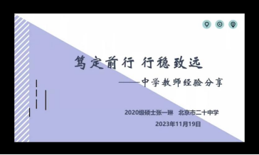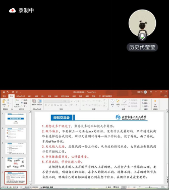 第三位分享人是张一琳师姐,师姐的分享以“笃定前行,行稳致远”为开场白,希望师弟师妹们在求职就业过程中,脚踏实地,情绪稳定的找到自己心仪的工作,首先师姐建议大家了解自身的职业规划以及发展目标,然后确定具体岗位,提前准备好相关证明材料,准备笔试时切实掌握好课本内容,教育理论等,面试阶段要注意教学过程的完整性、板书的书写、师生互动等方面。最后师姐强调自我认知的重要性,让同学们明白了只有充分了解自己的重要性,保持自信,做好自己笃定前行,才能更好面对未来挑战。