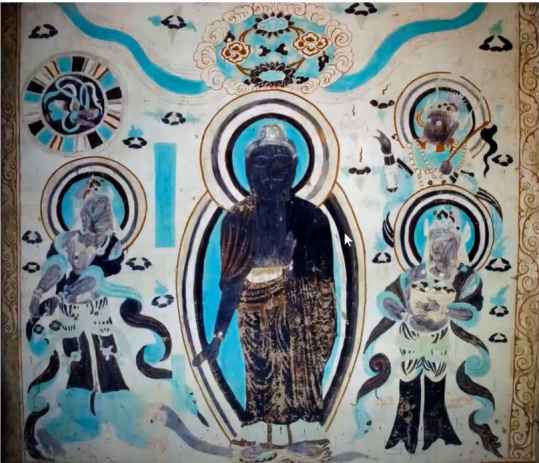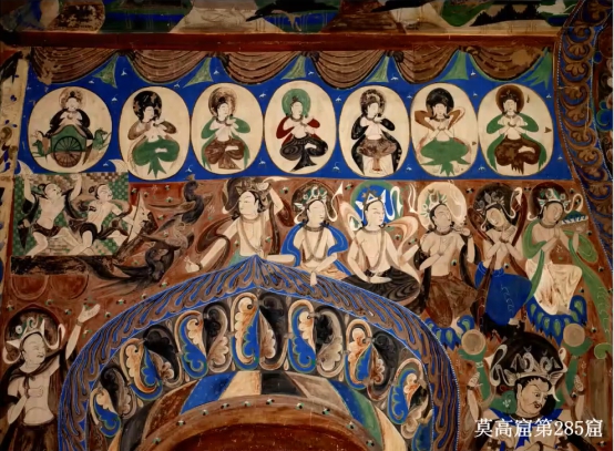 西魏时期(535-556)的代表窟为第285窟和第249窟。这一时期的艺术特色表现出敷色浓丽的西域风格与色调清新的南朝风格谐调并存于同一洞窟。