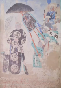 榆林窟第39窟,方向东偏北 20°,建于唐代,沙州回鹘、元代、清代重修。主室偏后设中心柱,柱四面各开一圆券龛。本窟壁画几乎均经回鹘重绘,在敦煌石窟中堪称孤例,为敦煌石窟沙州回鹘洞窟之代表作品。