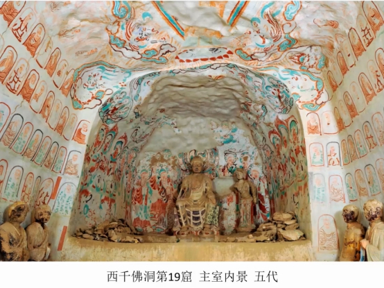 西千佛洞第19窟,方向南偏东10°,建于五代,北宋重修。此窟最引人注意的是为数众多的罗汉像,除龛内与窟顶外,窟内其他各处遍绘罗汉像,东、西两壁还有罗汉彩塑,罗汉像总数原应近两百身,可谓罗汉之窟。这种遍绘罗汉像的洞窟,在敦煌石窟中仅此一例。