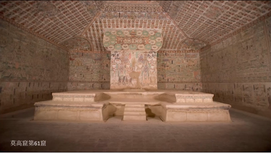 五代时期(907-960)的代表窟是第61窟。五代沿袭晚唐传统,在画院画师或画行画匠的率领下,在公式化的经变画上形成了统一的风格,表现技法、艺术水平,远不及唐代,但在肖像画、故事画、山水画和巨型壁画的制作上仍有独特的成就。