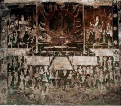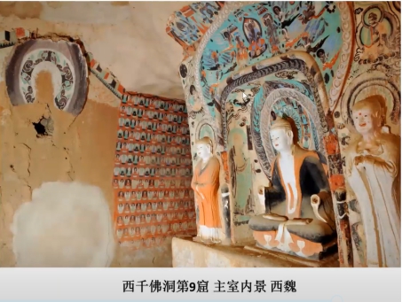 西千佛洞第9窟,方向南偏东35°,建于西魏,北周、隋、初唐、西夏、清代重修。此窟经多个时代重修,洞窟内容复杂。现存主室前部人字披、后部平棋顶,有中心柱。本窟在西千佛洞颇具代表性,一是中心柱南向面以绿色为底色的龛楣,二是西壁南端西魏朱墨白描的伎乐飞天,都是敦煌石窟中独一无二的作品。