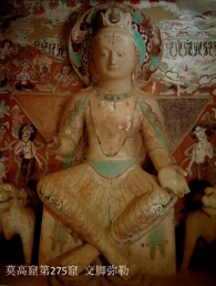 莫高窟现存最早的洞窟是北凉(421-439)三窟,即第268、272、275窟。此三窟的结构与功能不尽相同,是一次性建造的禅室、佛殿、佛堂的三堂组合,集禅修、礼拜、讲经说法为一体的完整的石窟群。由于此时佛教艺术传入不久,所以北凉三窟的艺术特点以印度及西域风格为主。