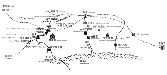 榆林窟位于甘肃省瓜州县城南约70公里榆林河东西两岸的峭壁上,其所在地瓜州位于河西走廊的西端,西侧紧邻敦煌,同为古代丝绸之路上的重镇。