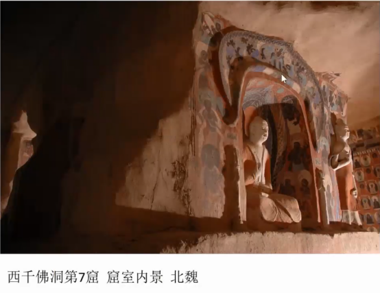 西千佛洞第7窟,方向南偏东20°,建于北魏,西魏、清代重修。此窟为西千佛洞现存时代最早的洞窟,其所处的北魏晚期(525-534)正值北魏东阳王元荣任瓜州刺史时期。东阳王元荣及其家族笃信佛教,在莫高窟主持修建了“东阳王窟”,同时期的西千佛洞营建亦有大的发展,此窟即为证明。现存主室前部人字披、后部平棋顶,有中心柱从地面直达窟顶,柱身与壁面之间形成右旋礼佛的通道。整个洞窟的风格与莫高窟北魏晚期洞窟相似,带有浓厚的西域特征,彩塑为秀骨清像,壁画人物则粗犷豪放,虽为早期洞窟,但在技艺上已入纯熟练达之境。