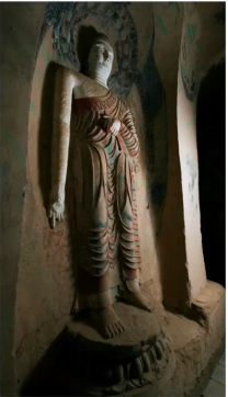 榆林窟第28窟,方向南偏西30°,建于初唐,北宋、西夏、清代重修。主室前部崩毁,有中心柱,中心柱北向面还保存了一身高大完整的初唐凉州瑞像的彩塑,成为当时凉州瑞像流行于瓜州地区的历史见证。