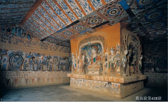 北周时期(557-580)的代表窟是第428窟。该窟规模空前,艺术内容也更为丰富。北周前期壁画人物造型健壮,晕染多样化,画风日趋写实,生活气息浓厚。后期中原艺术流派涌入,多处呈现出明显的张家样风格。