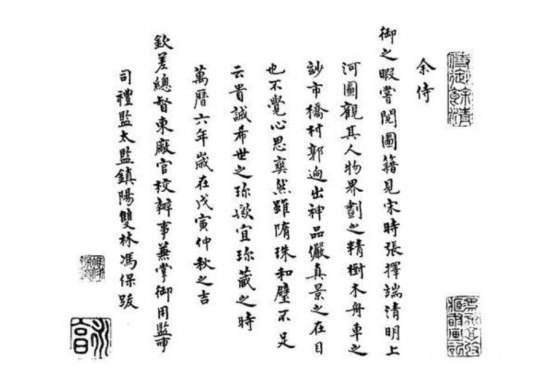 第三,《清明上河图》冯保题款。万历时期司礼监太监冯保在《清明上河图》上作文并盖上自己的四个印章。其中左下角的两个印章,其上为“冯保之印”,其下为“永亭”,乃是冯保的字号。