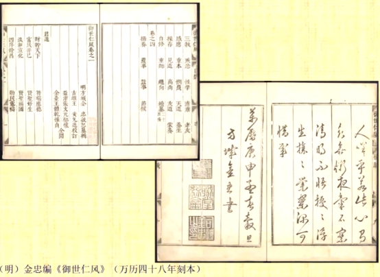 第六,金忠在万历晚期到天启初年还编过一本《御世仁风》,这是与《帝鉴图说》相类似的专门为皇帝编写的书籍,书里面所传达的理念与明代士大夫们所积极追求的政治理念高度契合,与东林人士的政治主张非常一致。书末作者的跋文后面有三枚印章,第一个为“中都留守”,第二个为“职掌丝纶”,第三个为“司礼金忠之印”。“中都留守”、“职掌丝纶”的意思为司礼监太监金忠任中都凤阳留守太监,相当于掌握着实际权力的地方大员。