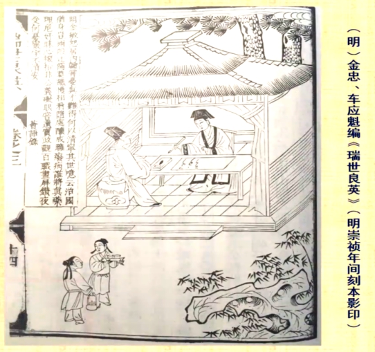 第五,明末太监金忠、车应魁合编的《瑞世良英》,这是一本图文并茂的社会教化性著作。编者是出身为宦官的金忠。书中有其自画像,坐在亭子里面、拿着毛笔正在写草书,图画旁还有配文“明金敏忠居内翰,尝忧真才难得……”,同样出现了“内翰”的字样。