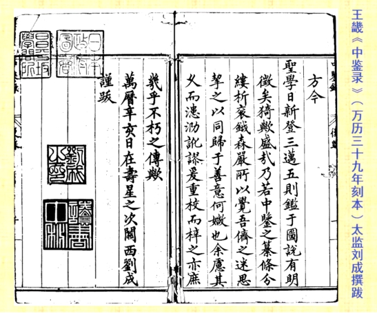 王畿撰写《中鉴录》直接针对万历皇帝幼年即位的政治背景,试图以此感召宦官来帮助辅养君德。编写完成后,王畿虽苦心推广,但反馈意见寥寥,未曾得到王门友朋的重视和支持。但该书却吸引了宦官的瞩目,首刊者与重刊者分别是万历年间提督苏州织造的两任太监。首刊者孙隆受过内书堂良好教育,是万历皇帝的内廷老师,志于训育储君。关于重刊者刘成,他在《中鉴录》跋文中留下两个印章:“刘成之印”和“读书中秘”。明代翰林院出身的士大夫才敢称“读书中秘”,这表明宦官刘成对自己的文化水平也是相当自信。