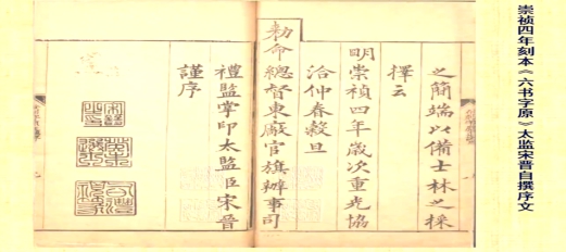 第二,崇祯四年刻本《六书字原》太监宋晋自撰序文。这个序文有三枚印章,第一个为“宋晋之印”,第二个为“癸未选士”,第三个为“司礼视篆”。同样出现了“选士”的字样。